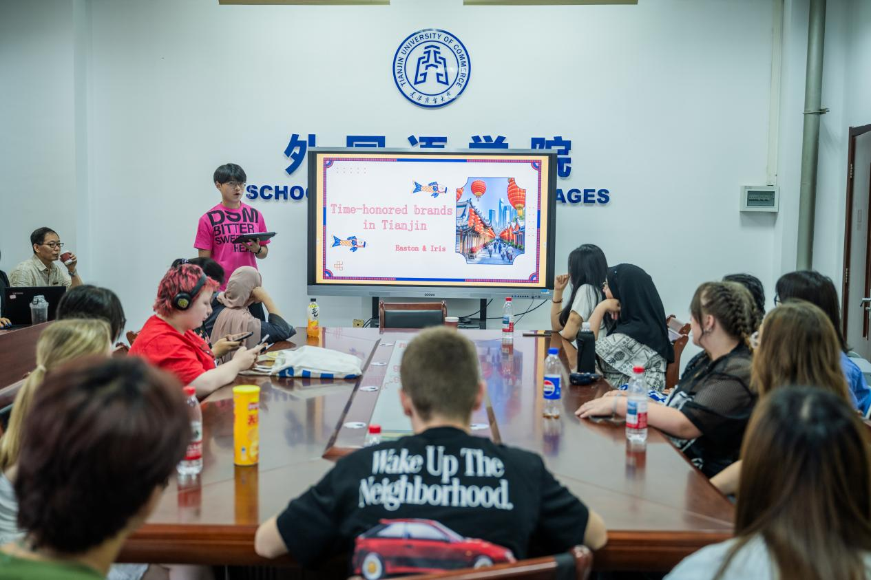 讲座结束后,英语系的王晓艳老师带领两名学生向代表团介绍了天津的两大传统老字号:桂发祥十八街麻花和天津相声。学生不仅讲解了十八街麻花的独特制作工艺和悠久历史,还现场展示了天津相声的幽默与智慧。为了让英国学生更直观地感受天津老字号的独特魅力,外国语学院还特意为代表团准备了桂发祥十八街麻花,让他们在品尝中感受天津美食文化的独特风味,对中国传统文化有了更加深刻、更加难忘的印象。