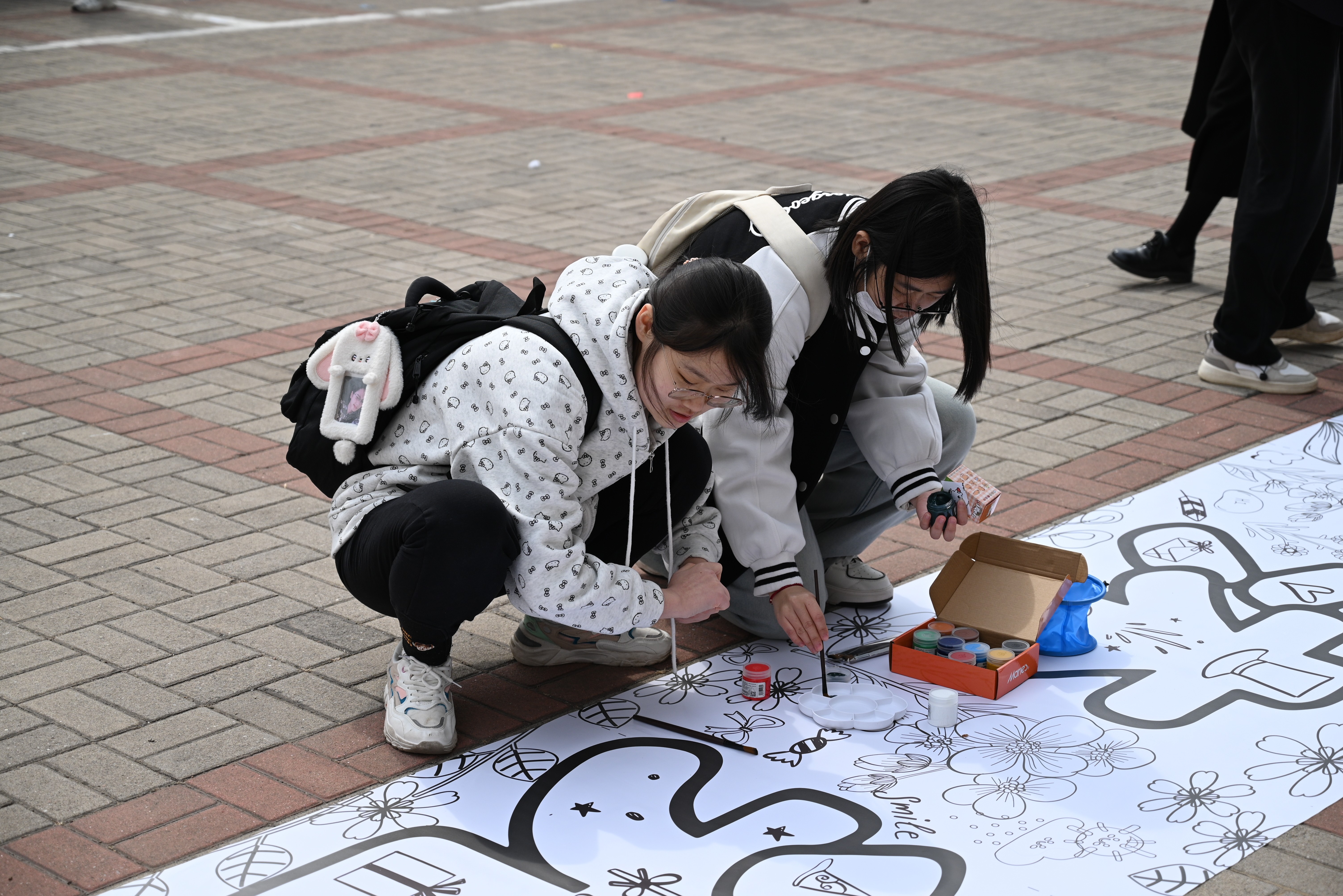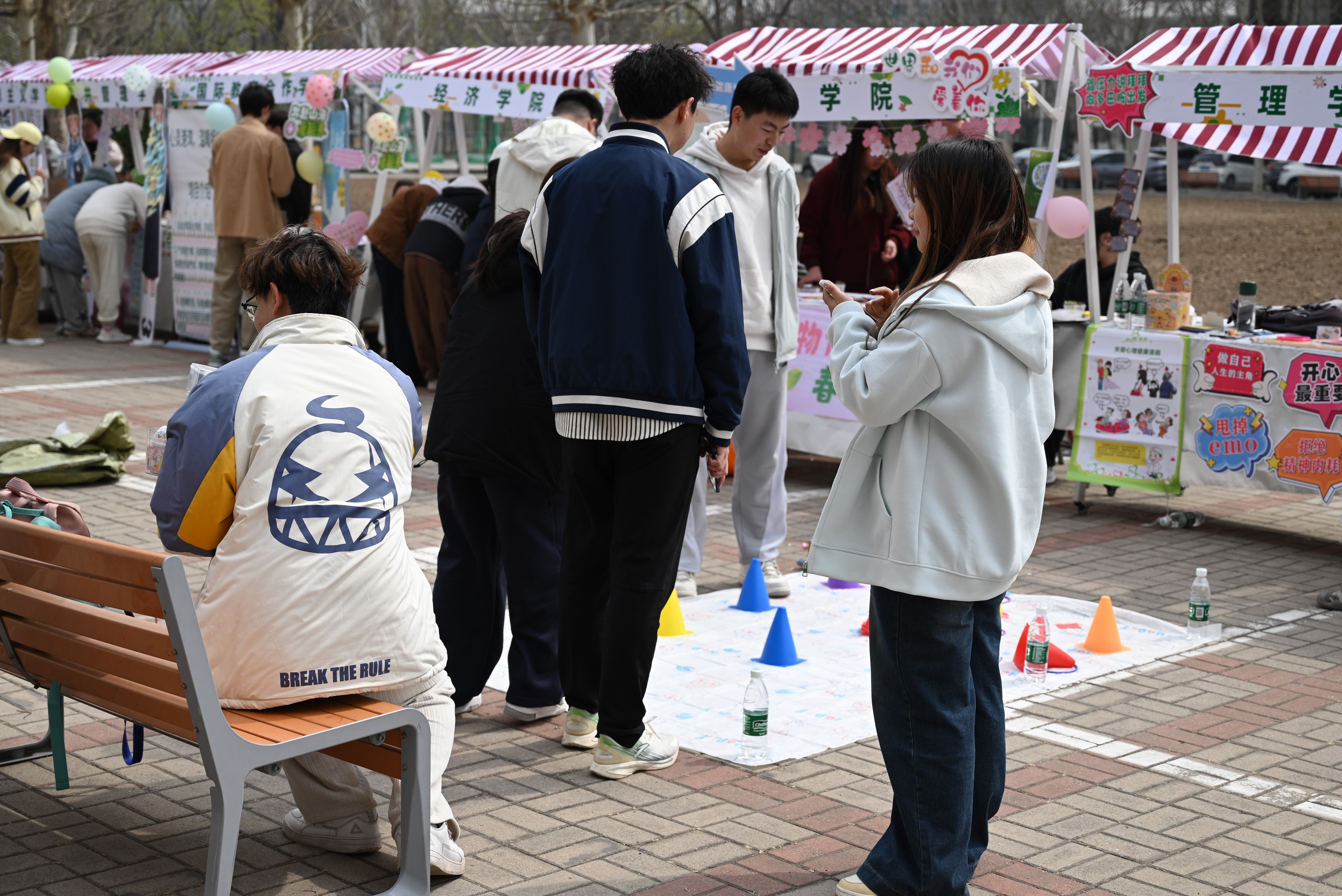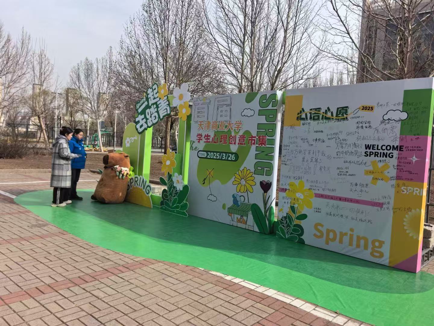 本次市集以“五育融合”为核心,设置多项特色板块。“心语心愿墙”前,学生们写下对未来的期许、对朋辈的祝福或对自我的鼓励。通过文字传递情感共鸣,帮助学生在表达中释放压力、收获支持。在“玩偶打卡区”,憨态可掬的巨型玩偶卡皮巴拉成为现场人气焦点,学生纷纷合影留念,并通过互动游戏赢取心理健康主题纪念品。“手绘心长卷”在突出色彩疗愈,共绘心声。长达十五米的空白画布前,参与者用颜料共同绘制“心灵画卷”,通过集体创作激发学生的创造力与协作精神,用色彩表达情绪。各学院展示摊位前人头攒动,热闹非凡,欢声笑语不断。现场设置“心理知识问答”“情绪卡片配对”“撕掉不合理标签”“领养生命力”等游戏,让学生在互动中学习压力管理技巧,提升心理健康素养。参与学生普遍反馈,活动形式新颖且贴近需求。