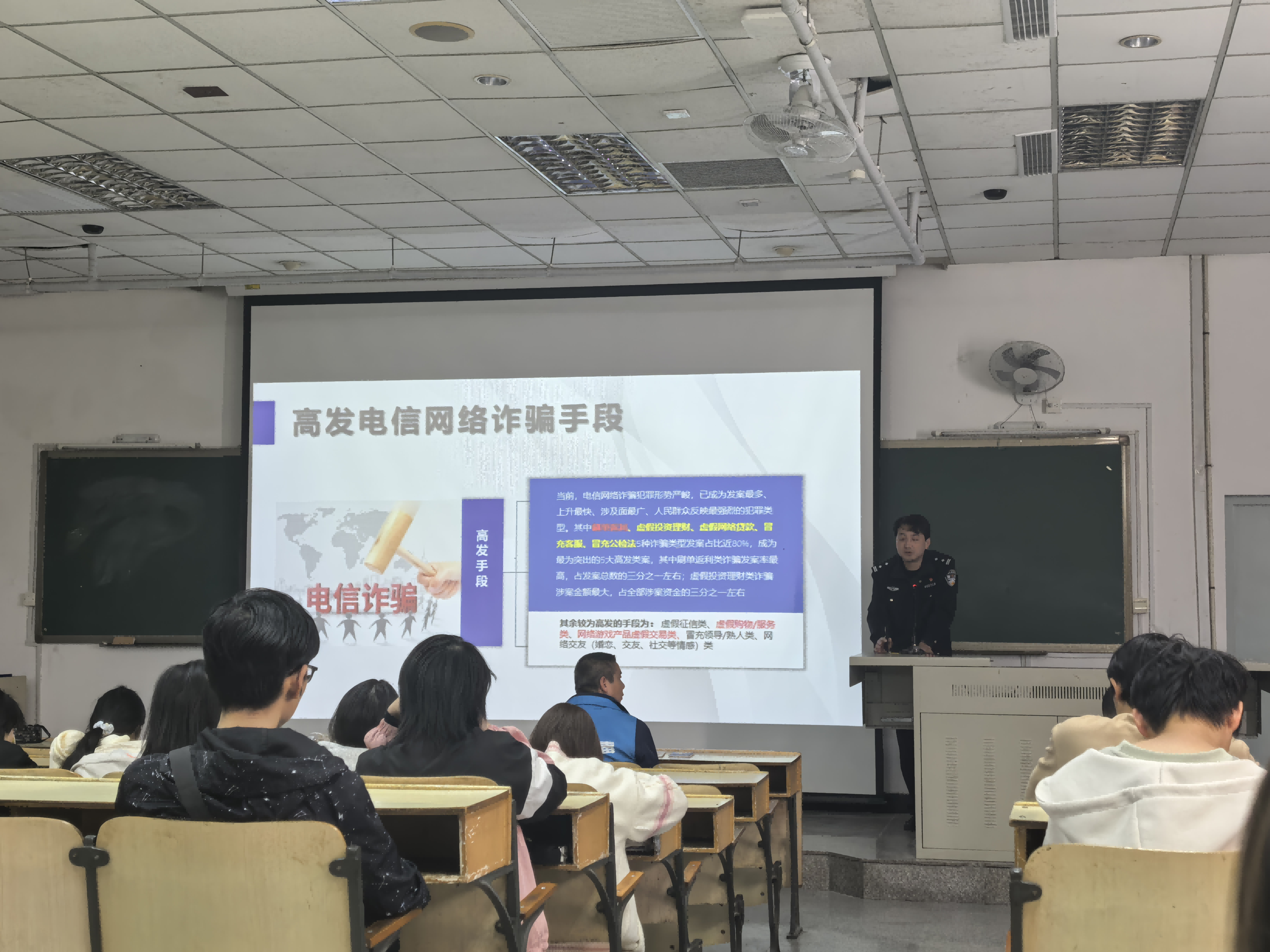 为有效筑牢广大师生的反诈防线,全方位增强反诈能力,4月2日,在学校保卫处的支持下,信息工程学院在4教102开展“防范于心,反诈于行”安全教育活动,北辰公安分局打击犯罪侦查支队队长段政兴受邀授课。北辰公安分局相关警官、学院辅导员出席活动,300余名学生积极参加。