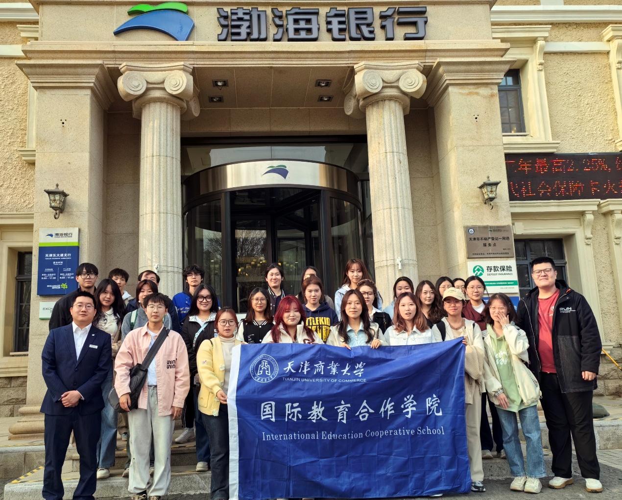 3月13日,国际教育合作学院组织20余名同学前往渤海银行(五大道支行)开展参观研学活动。渤海银行(五大道支行)私人银行客户经理杨瑀珂接待了师生一行,并为大家带来了一场干货满满的银行业知识分享会。