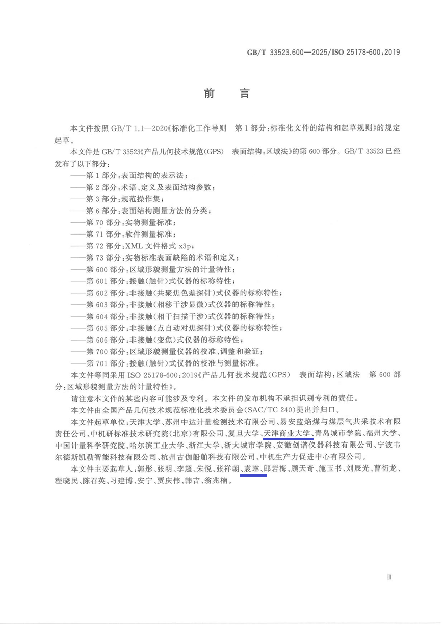 近日,由星空XK体育机械工程学院教师袁琳参与制定的国家标准《产品几何技术规范(GPS)表面结构:区域法第600部分:区域形貌测量方法的计量特性》(GB/T 33523.600-2025)正式发布。该标准由全国产品几何技术规范标准化技术委员会(TC240)归口,国家标准化管理委员会主管,是我国在产品几何技术规范领域的重要标准之一。