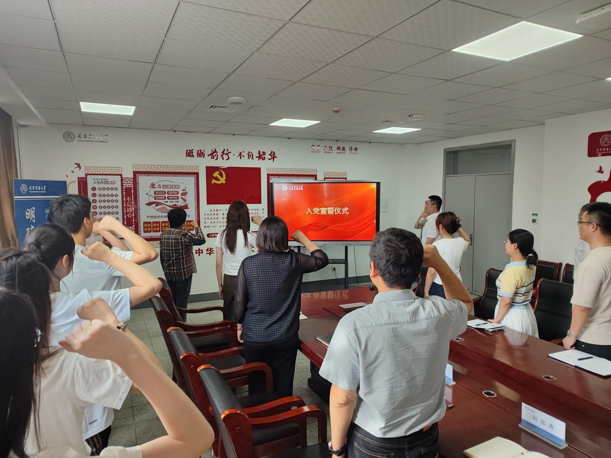 活动伊始,全体起立奏唱国际歌。与会教师为新发展的党员代表佩戴党徽。在张莹的带领下,党员们面向党旗,高举右拳,庄严宣誓,用洪亮的声音表达为共产主义事业奋斗终身的坚定决心。