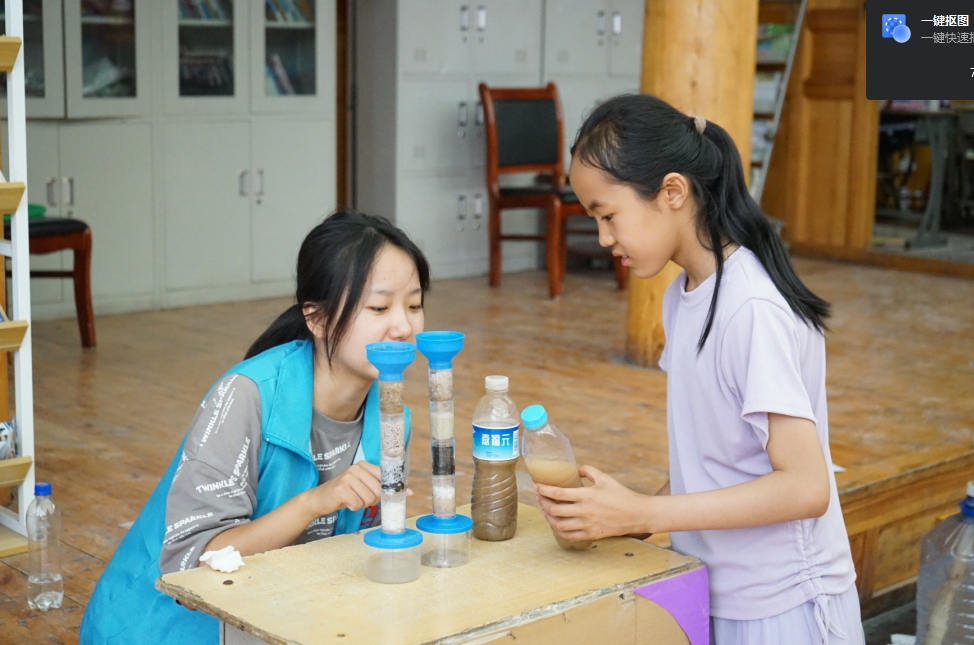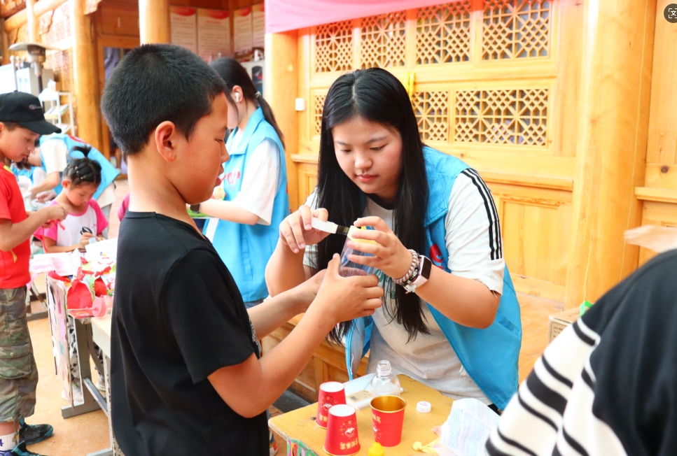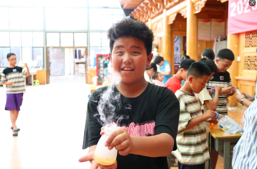 本次市集活动由一场干冰中投入热水产生的“云海”正式拉开序幕。“这就是二氧化碳,它既能造雾,也能加剧温室效应。”支教队队长吴丹借机科普,“保护环境,就是让白云留在天上,而不是变成废气飘在空气里。”市集分为活动签到区、科技展示区、文创体验区、环保体验区、游戏互动区、未来机器人6个体验区。在环保空调前,支教队员现场演示“零氟制冷”,孩子们惊呼“原来清凉也可以零碳”;在文创体验区,毛笔写下“三江之源,绿我中华”的书签轻摇墨香;创意手工制品如奶茶包装袋纸巾筒等,激发了大家的环保创意。垃圾分类沙包投掷、环保迷宫、转换生态等互动游戏,让环保理念在寓教于乐中走进同学们心中,机器人的炫酷表演,更是点燃了青少年们内心中的创新火种。