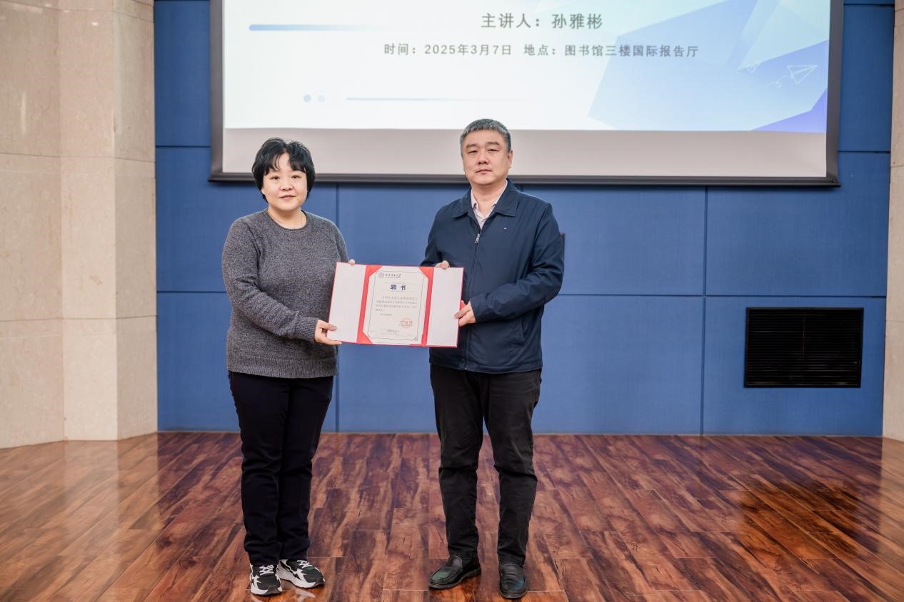 讲座开始前,张莹为孙雅彬颁发聘书,聘任其为机械工程学院兼职思政教育校外导师、法治辅导员。