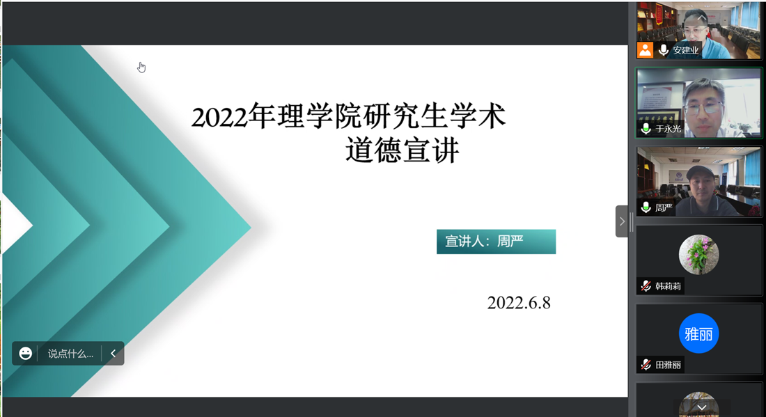 6月8日下午,理学院2022年第五场“研之有理”学术报告会以线上形式召开。北京交通大学数学与统计学院院长于永光教授受邀作学术报告,理学院副院长周严教授进行学术道德宣讲。会议由理学院院长安建业主持,师生70余人参加报告会。