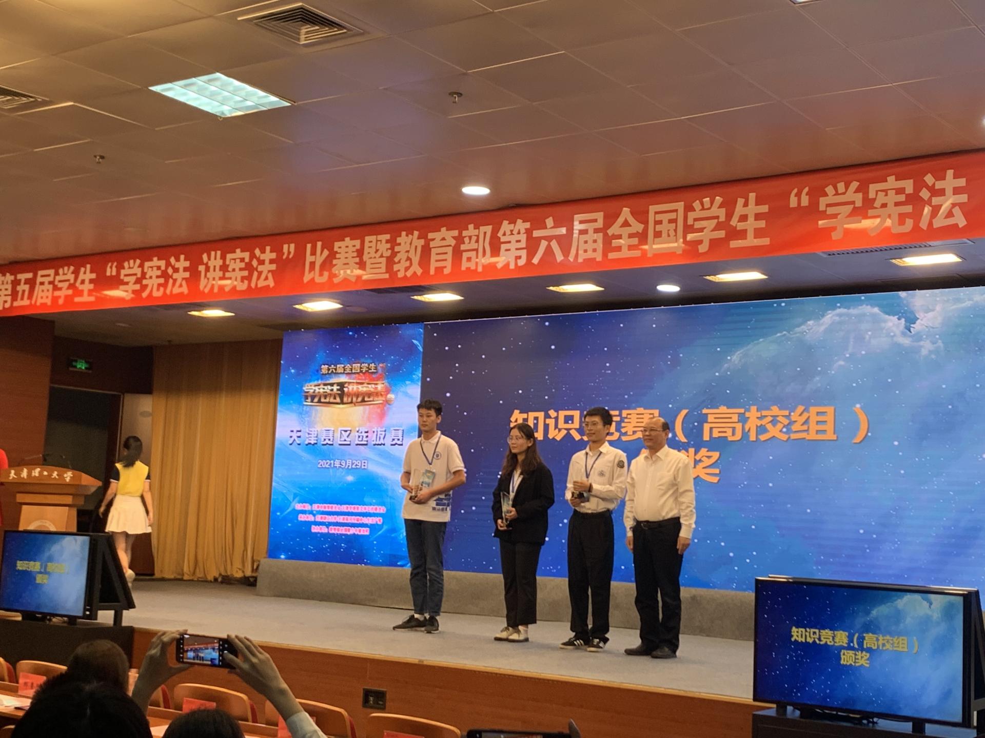 9月29日,天津市第五届学生“学宪法 讲宪法”比赛暨教育部第六届全国学生“学宪法 讲宪法”活动天津赛区选拔赛在天津理工大学举办。法学院学生万欣悦、冯肃雅凭借优秀的现场表现,分别获得高校组知识竞赛冠军和高校(高职)组演讲比赛三等奖。