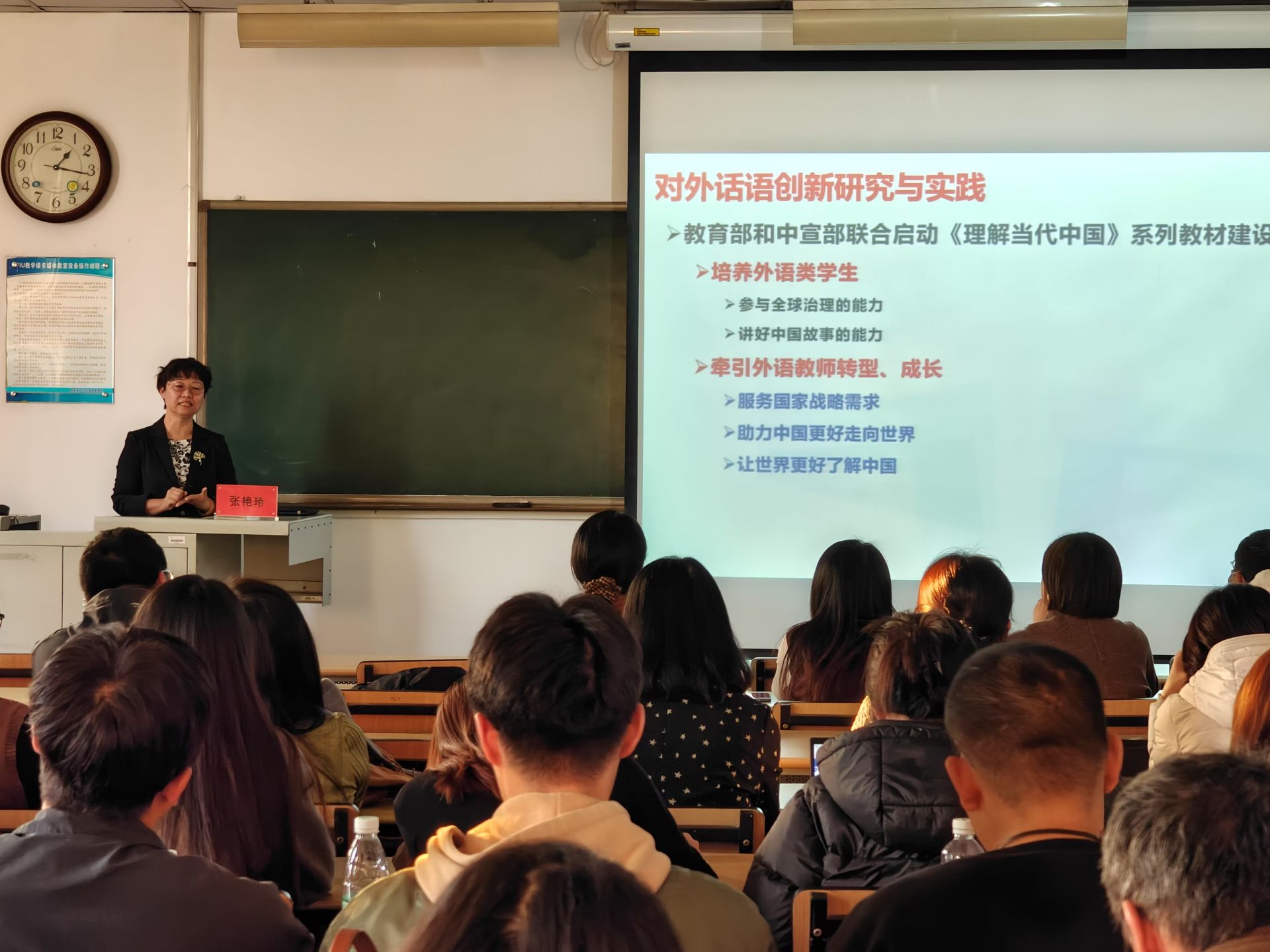 12月4日下午,中国民航大学外国语学院院长张艳玲教授应邀莅临星空讲学,讲座题目为“守正创新,和而不同——行业特色翻译硕士人才培养的中国民航大学实践”。讲座由外国语学院副院长荆红艳主持,外国语学院全体教师和部分研究生在FIU-F401教室聆听讲座。