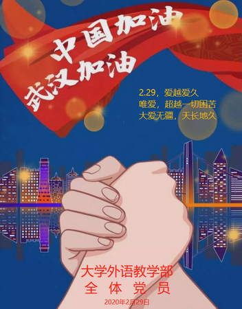 在共同学习了新华社2月26日《习近平总书记在统筹推进新冠肺炎疫情防控和经济社会发展工作部署会议上的讲话》新闻报道后,总支书记赵建洪传达了上级党组织部署的党员自愿捐款支持新冠肺炎疫情防控工作的要求,说明捐款用途,并就国家强有力的疫情防控举措带头发言,号召党员立足行动。教学部主任朱虹、支部书记门智芳、何云以及各支部党员代表也分别结合疫情防控战斗中涌现出来的先进人物和先进事迹畅谈自己的感想。大外部29名党员响应号召,积极行动,在2月29日早8点完成捐款。