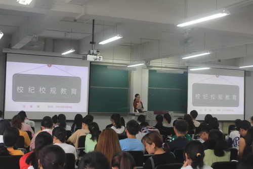 校规校纪是学院新生入学教育的一项重要内容,理学院近日在7号教学楼302室举行校规校纪教育讲座。2019级辅导员狄佩佩主讲,2019级全体新生到场聆听。