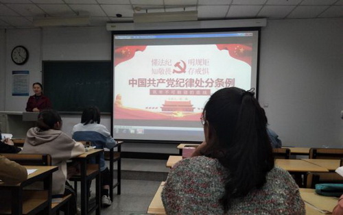 4月18日,党委副书记张娟以“懂法纪,明规矩,知敬畏,存戒惧”为主题将新修订的《中国共产党纪律处分条例》内容进行了逐条解读,旨在让同学们了解《条例》的指导思想和原则以及适用范围,让大家认识到党中央将全面从严治党向纵深推进的坚定信心。通过学习,同学们认识到党纪党规和筑牢底线的重要性。