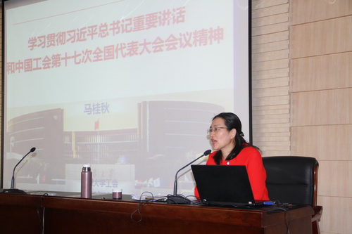 马桂秋带领大家重温了习近平总书记关于工人阶级和工会工作重要论述,学习了习近平总书记重要讲话、王沪宁同志代表党中央致的贺词、李克强总理做的形势政策报告和王东明主席所作工会工作报告,介绍了中国工会第十七次全国代表大会的盛况,分享了感悟体会。她指出,各级工会干部要坚定政治立场,坚持党的领导,落实习近平总书记“三个着力”的工作要求,要引领广大教职工听党话、跟党走,在新时代主题下建功立业。