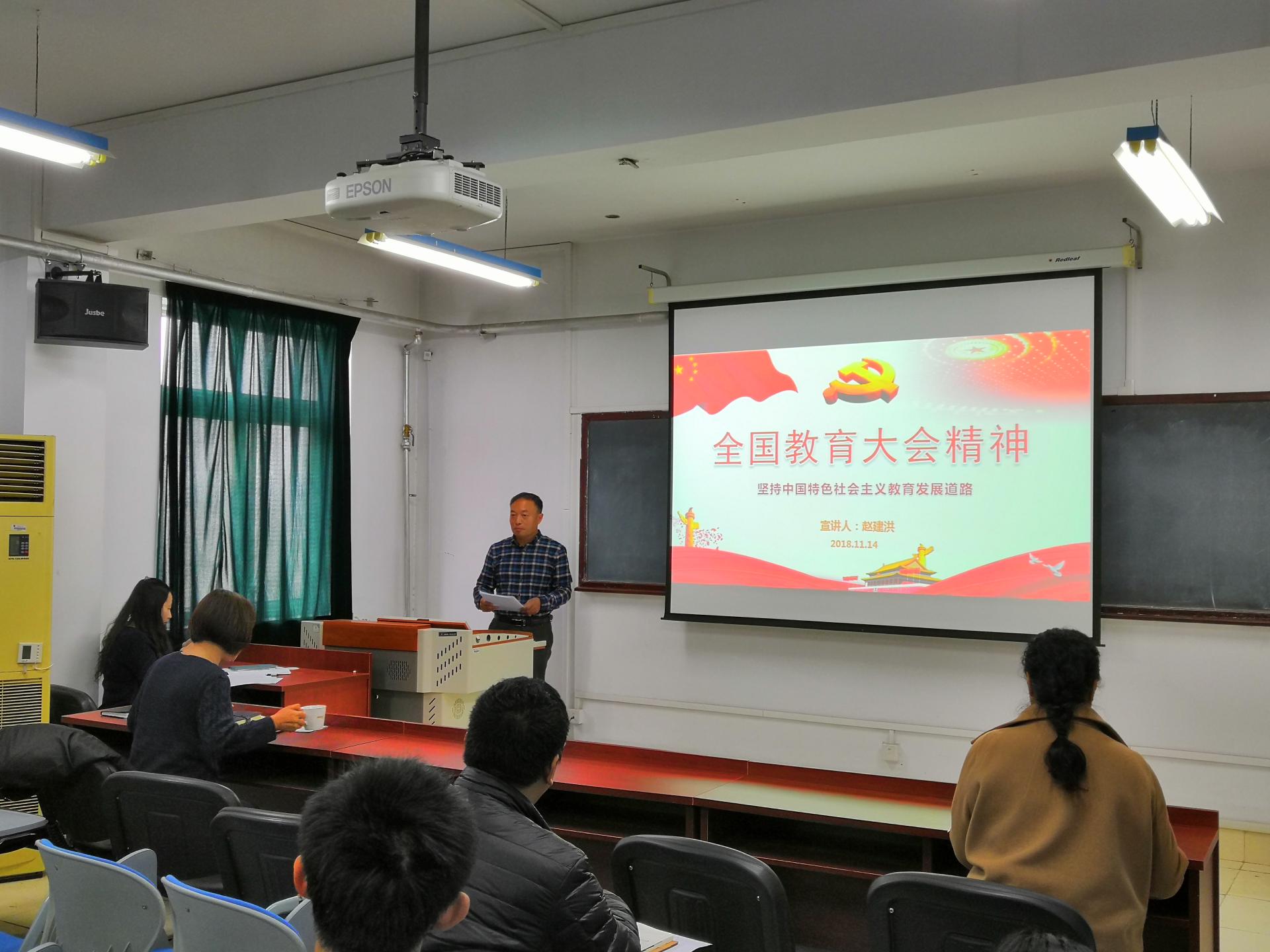 赵建洪从充分认识全国教育大会意义、“九个坚持”、“六个下功夫”、新时代教育新思想新战略等方面进行宣讲;朱虹从“四有好老师”、“四个相统一”、“三个牢固树立”等方面进行宣讲。宣讲前部门二级理论学习中心组进行了集中学习,并对宣讲工作进行了精心准备和组织。