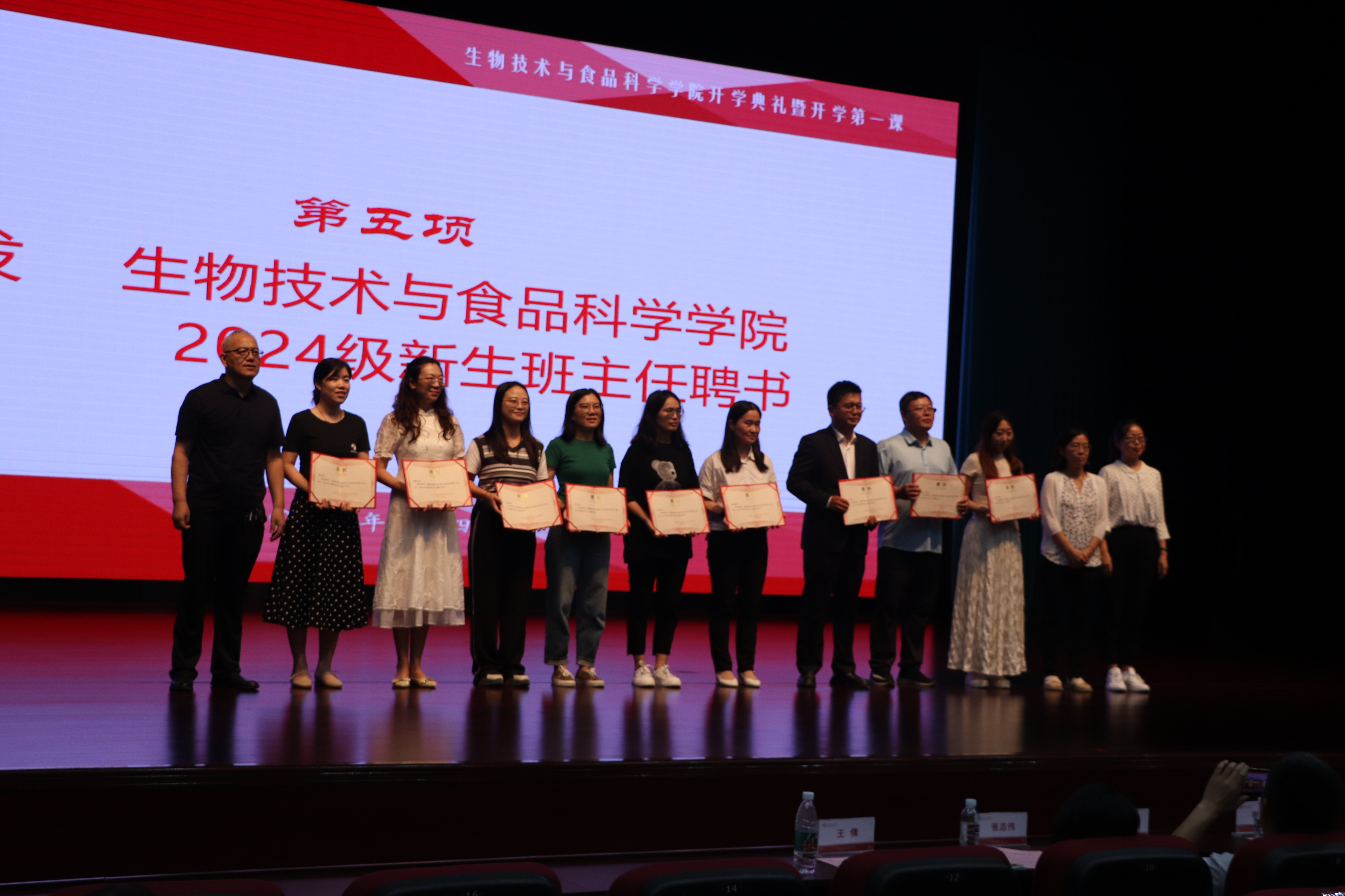 开学典礼上,学院为担任班主任时间超过15年的资深班主任颁发了生物技术与食品科学学院第一届班主任“匠心奖”,同时为2024级新生班主任颁发了班主任聘书。