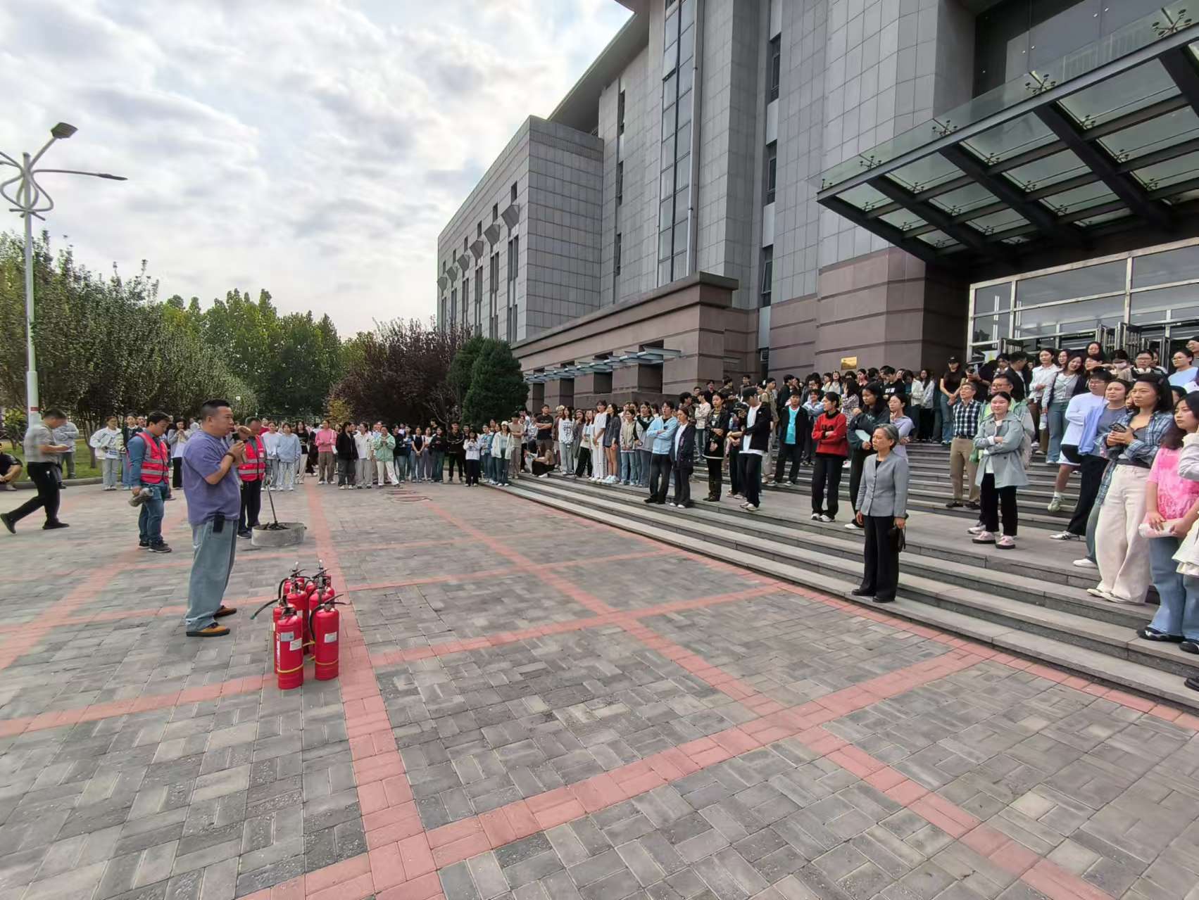 演习中,随着模拟火警信号的急促响起,图书馆各点位教职工迅速引导馆内的师生读者按照疏散路线从各疏散出口有序撤离至安全区域。并在疏散过程中,积极维护现场秩序,指导学生保持冷静,不推挤、不慌乱,确保了疏散的高效与安全。疏散完毕后,学校保卫处组织师生在图书馆前广场进行灭火器材实操培训,详细介绍了灭火器的正确使用方法。现场师生积极参与灭火演练,进一步熟练掌握基本消防技能。