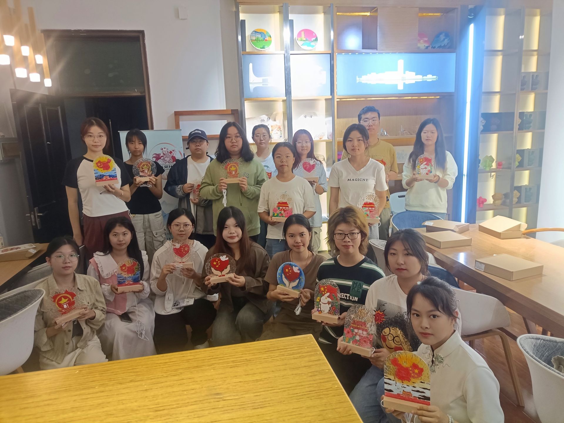 活动现场,同学们观看了掐丝珐琅非遗技艺纪录片,了解了这项传统非遗技艺的历史渊源,并亲手制作了掐丝珐琅玻璃画小夜灯,通过勾画线稿、掐丝填色、风干安装等步骤,绘制出“红星闪闪”“我的中国心”“破浪红船”等图案的作品,表达对祖国的深沉热爱和美好祝愿。活动后,同学们纷纷与自己制作完成的作品合影,留下珍贵瞬间。