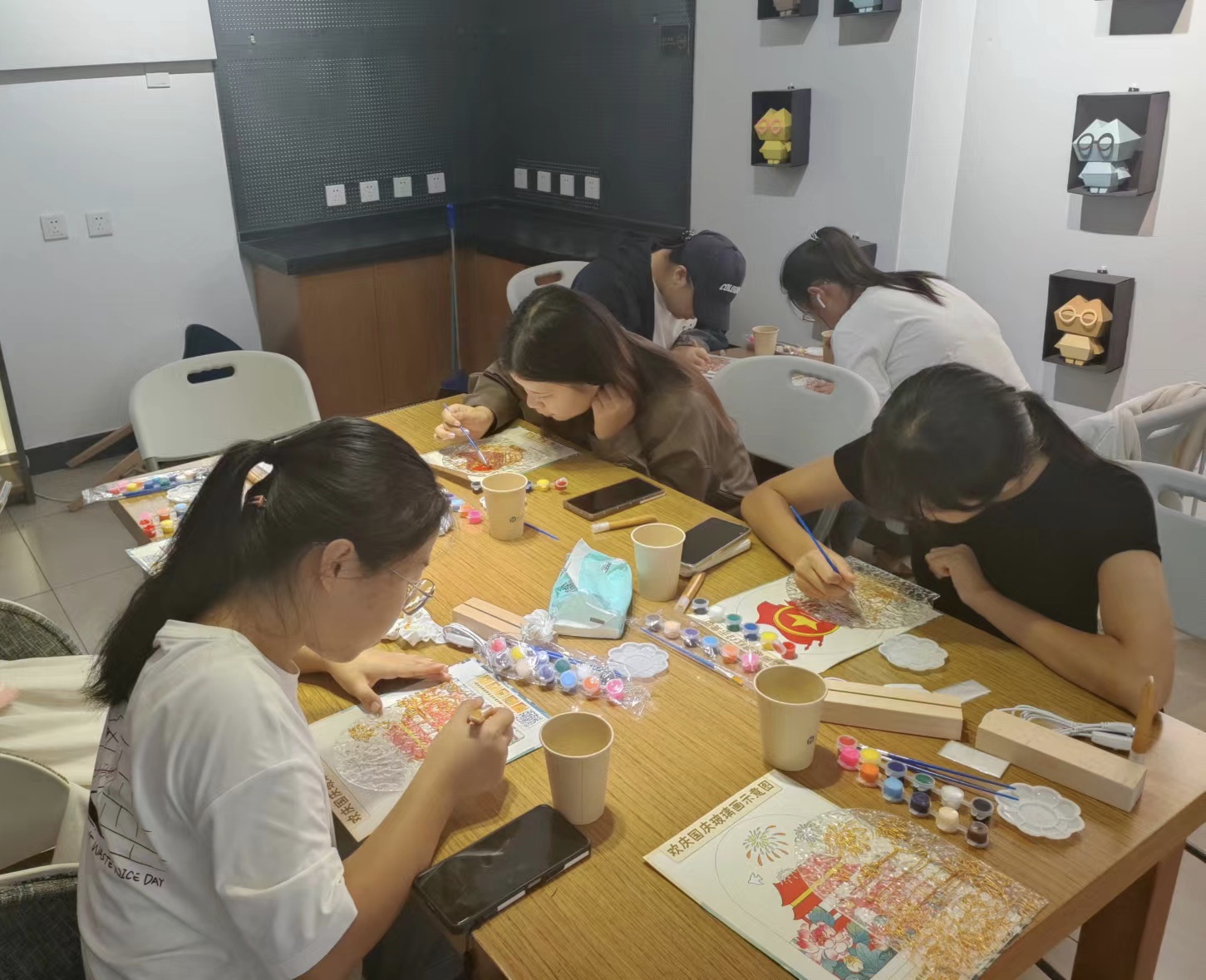 为庆祝中华人民共和国成立75周年华诞,引导学生通过传承非遗技艺、弘扬传统文化的方式表达对祖国的真挚情感,9月28日晚,党委学工部在“弘毅”劳动坊组织开展“国泰民安,青春告白”掐丝珐琅玻璃画手工制作活动,各学院学生代表在民俗文化弘扬社的带领下进行手工制作,在一笔一画中勾勒出对祖国的深情告白。