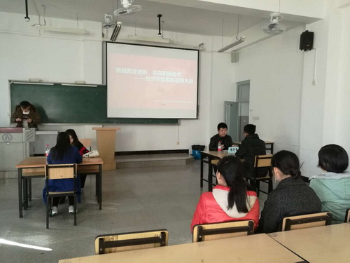 11月27日下午,经济学院在3号教学楼举办第二届“挑战就业潜能、赢在职场起点”简历设计与模拟招聘比赛。2016届目前就职政府机构和银行等单位的部分优秀毕业生担任面试评审。2014级学生参加。