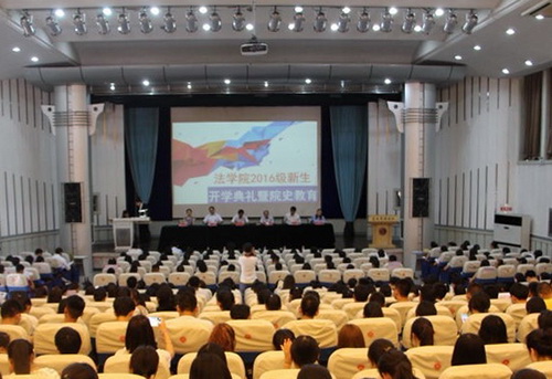 9月5日下午,法学院在学术交流中心举办了2016级新生开学典礼暨院史教育活动。学院全体领导、系主任、辅导员及新生班主任出席,2016级335名本科生、54名研究生参加典礼。