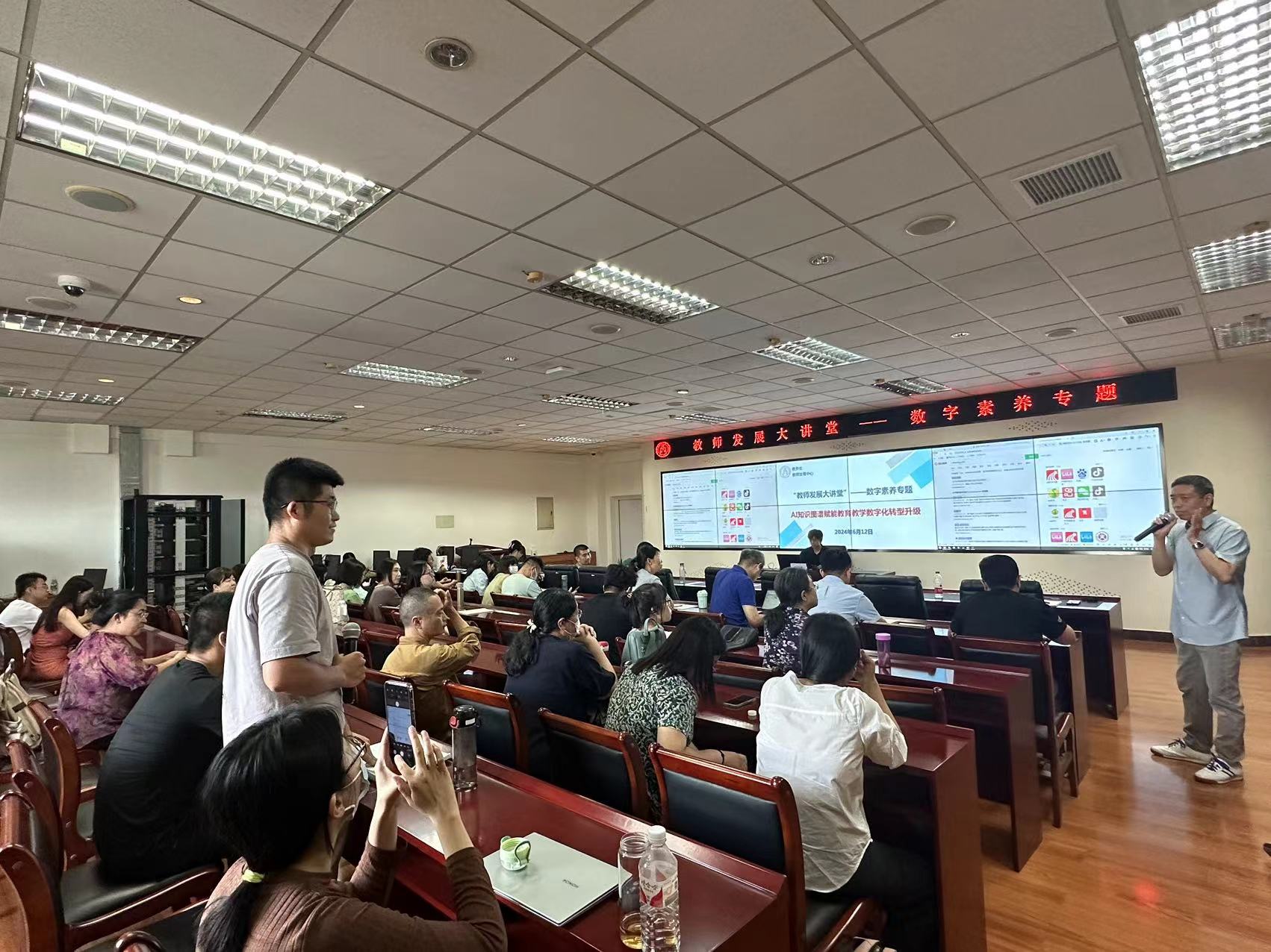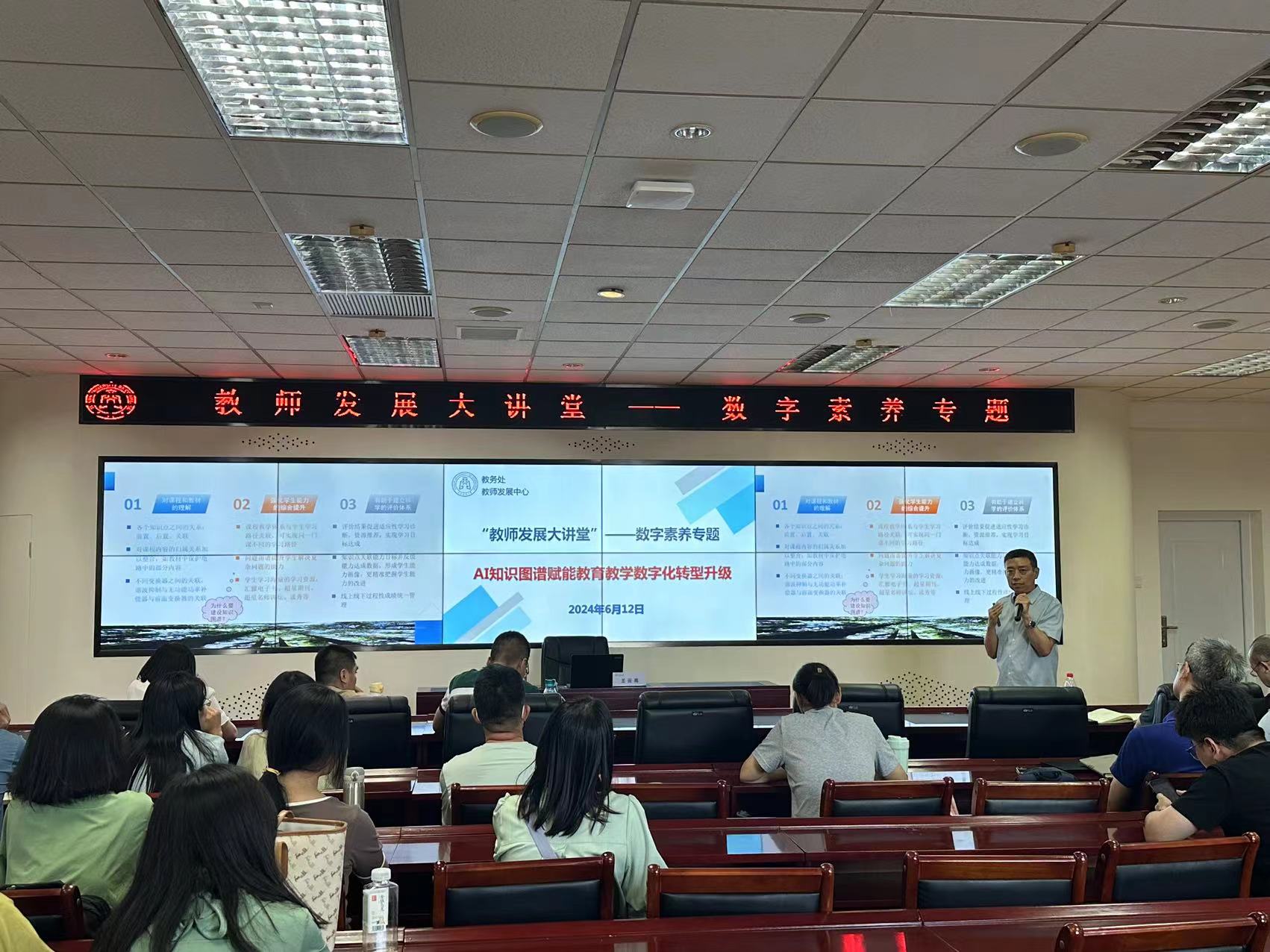 6月12日下午,教务处、教师发展中心共同举办数字素养专题“教师发展大讲堂”。本期特邀天津市教学名师、天津理工大学王云亮教授等为星空教师带来“AI知识图谱赋能教育教学数字化转型升级”主题分享,各学院专业负责人、核心课程负责人和教师代表50余人参加,教务处主要负责同志主持。