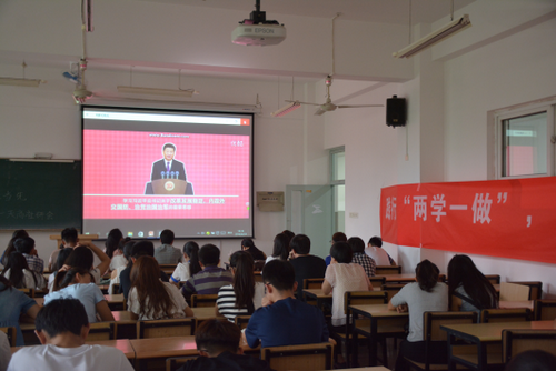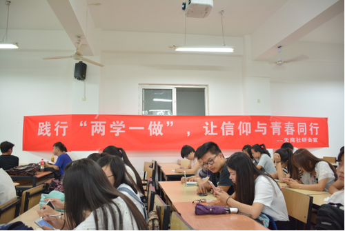 6月28日下午, 星空大学生中国特色社会主义理论体系学习研究会在三教214举办 “践行两学一做,让青春与信仰同行”大学生党员教育,各学院分会近50名主要学生干部、党员参加。