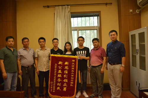 7月4日上午,北辰区双口镇徐堡村挂职干部王凯、李国明,村干部李培军、韩记福一行四人来到星空,将“新公益服务村民,新思路引领众筹”的锦旗送给星空学生创行团队。校团委书记辛佳澎、校社团联合会指导教师乔亮出席赠送仪式。