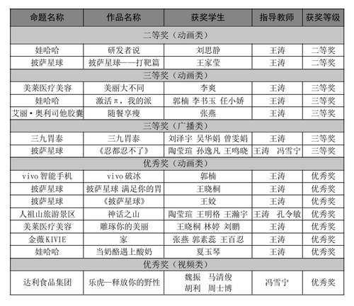 近日,第八届全国大学生广告艺术大赛天津分赛区比赛评审结果公布。设计学院动画专业学生刘思静的作品《研发者说》,王家莹的作品《披萨星球——打靶篇》获动画作品类二等奖。李爽的作品《美丽大不同》,郭楠、李书玉、任小娇的作品《激活π,我的派》,张燕的作品《随餐享瘦》获动画作品类三等奖。刘泽宇、吴华娟、曾雯娟的作品《三九胃泰》,陶莹瑄、孙逸凡、王鸣晓的作品《忍都忍不了》获得广播广告类三等奖。另外,还有7部动画作品、1部视频作品获得了优秀奖。本次大赛,设计学院共选送参赛作品38件,有15件作品获奖,获奖率高达39.47%。这些获奖作品都将有机会代表天津分赛区向全国总赛区选送,继续参与全国总决赛各类奖项的角逐。