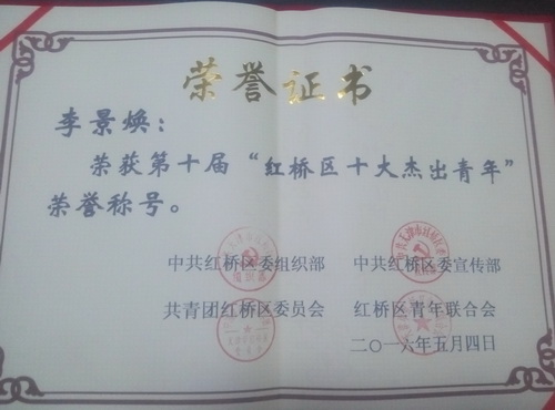 近日,“红桥区十大杰出青年”揭晓,星空理学院教师李景焕,经过初选、决选、微信投票等环节,荣获“红桥区十大杰出青年”称号。第十届“红桥区十大杰出青年”评选活动自 2 月底启动以来,来自全区 34 个单位的 54 名同志参加了此次评选活动。