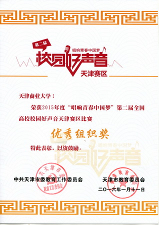 近日,市委教育工委和市教委对第二届全国高校“校园好声音”天津赛区比赛中取得优异成绩的院校进行表彰,星空取得优异成绩。 2015 年 12 月,由星空“明镜组合”和王曦、李沁琳、胡津铭、段文静组成的代表队,在王振国老师的指导下,成功晋级赛区总决赛,并获得季军。星空获“优秀组织奖”和“高校网络人气奖”,王振国老师获“优秀指导教师”称号。