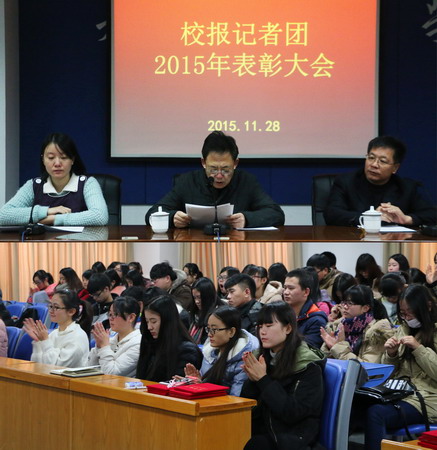 上午在图书馆弘毅厅举办了记者团 2015 年表彰会暨主题报告会。表彰会上,现任团长袁奕好对记者团 2015 年的工作进行了汇报。随后,对记者团主要负责人进行聘用并对 2014 年度中国高校校报好新闻获奖者和优秀团务、团员和撰稿人进行了表彰。其中,袁奕好、王琪聘为校报记者团 2015-2016 年度团长、副团长;郝锦瑄、丁铮基、周洁等 7 人聘为 2015-2016 年度团务。在对 2014 年度中国高校校报好新闻获奖者的表彰中,王琪编辑的版面获“版面类二等奖”、袁奕好的摄影作品获“新闻摄影类三等奖”。在优秀团务、团员和撰稿人的表彰中,郝锦瑄、鲍玉妹、王文静 3 人获 2015-2016 年度“优秀团务”称号;李艺芳、吴锦昊、孟文清、张艳梅、周欣 5 人获“优秀团员”称号;王琪、席荣、周梦燨等 11 人获“优秀撰稿人”称号。