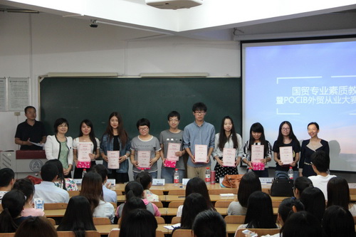 9 月 17 日 ,国贸专业素质教育暨 POCIB 外贸从业大赛颁奖及宣讲会在 3 教 310 举行。 院党委副书记张玉娟、 国贸系主任王威、国贸系党支部书记、教研室主任过晓颖、教师王昕以及国贸系辅导员杜志惠出席,国贸系全体 2013 级同学参加了宣讲会。