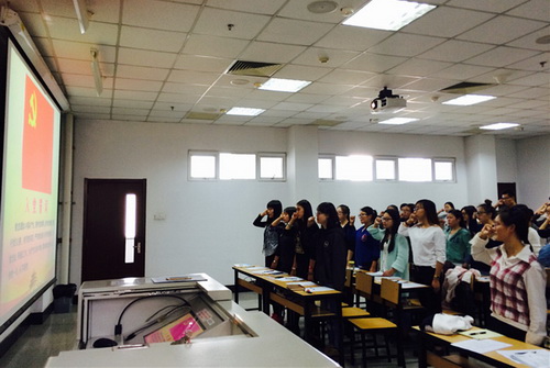本次会议第一项议程是工作指导与培训。骆媛以新《中国共产党章程》和《发展党员工作细则》为根本,以课件PPT为导读,从党员发展程序、新变化与重点内容、支部和党员的工作职责等方面进行了详细、重点讲解,为全体学生党员上了一堂生动的党课。第二项议程是工作要求与部署。骆媛从学生党员严以修身、严以律己、率先垂范、履职尽责、甘于奉献等方面对全体学生党员提出了明确的要求,并对党员责任区、党员联系班级责任制等工作进行了详细的部署和安排。第三项议程是责任承诺与宣誓。骆媛对党员责任进行了解读,全体学生党员签订了《学生党员责任制承诺书》,承诺书从 8 个方面自警、自省、自律、自查,为学生党员指出了明确而具体的努力要求,全体学生党员面对党旗庄严地许下了誓言,大会顺利圆满结束。