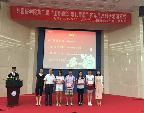 首先由“青年月”系列活动中的优秀班级及个人为大家进行成果展示。读书报告大赛一等奖得主英语 1302 班李佳星同学分享了她阅读经典名著《 pride and prejudice 》的感悟,带领观众一同步入到英国乡绅女儿伊丽莎白与达西先生浪漫感人的爱情故事中;摄影大赛的一张张照片再现了每一位参赛者的精彩作品,展现了镜头下的不同魅力;英语 1403 班的维权活动作品《 “ 权 ” 利以赴》以话剧和 PPT 的方式生动讲解了大学生兼职时遇到的问题,并通过调查问卷的形式分析其原因,呼吁大学生增强法制观念、提高维权意识;英语 1401 班的心理情景话剧《青春交响曲》将大学生中常见的沉迷网络、过于自我、考试作弊等问题淋漓尽致地呈现出来,诙谐的演绎及其幽默的台词为观众带来阵阵笑声的同时,也引发了大家对大学生活的反思和心理健康的重视。在欣赏完精彩的成果展示后,颁奖嘉宾为在“青年月”中表现出色的优秀团体和个人颁发了奖项。