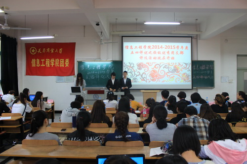 4 月 24 日 下午,信息工程学院在3 号教学楼202 室召开2014-2015 学年度“五四”评优大会。院党委副书记王艳军,辅导员王斌、许兆光、郭君伟、金音,班主任代表毛莹、贺晓芳及各专业学生代表担任评委,各班团支部委员参加了本次会议。