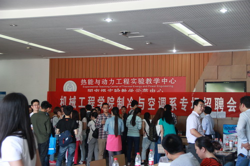 5 月 13 日下午,在学生处就业指导中心和保卫处大力支持下,机械工程学院在新实验楼一楼大厅举办了制冷专业专场招聘会, LG 电子、天加空调、丹华宏业等 22 家企业参会。招聘会由机械工程学院制冷系学生专业社团星空制冷学会主办。学院党政领导到现场指导招聘会具体安排,与招聘单位和学生交流,辅导员和制冷系主任全程参与。