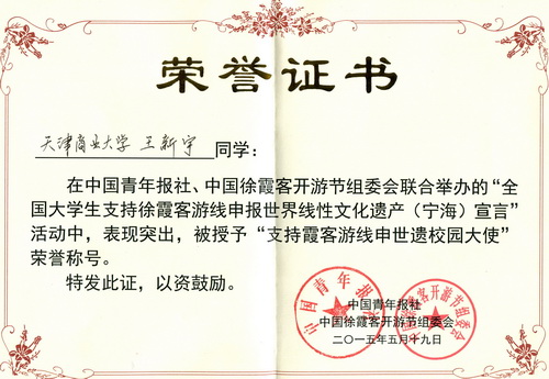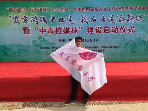 20 日,在由中国青年报社、中国徐霞客开游节组委会联合主办,中国高校传媒联盟、宁海县团委承办的“全国大学生支持徐霞客游线申报世界线性文化遗产(宁海)宣言”活动中,校广播台台长王新宇被授予“支持徐霞客游线申世遗校园大使”称号。