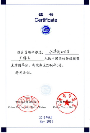 5 月 19 日,2015 中国高校传媒联盟主席团换届大会在浙江省宁海县举行。共青团中央学校部副部长李骥,中国高校传媒联盟秘书长、中国青年报社副总编辑董时出席会议。 会上,校广播台与清华大学《清新时报》、南开大学《南开青年报》社等 47 家校媒成为中国高校传媒联盟 2015 主席团单位。