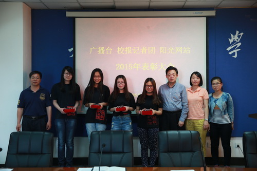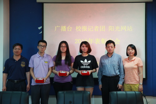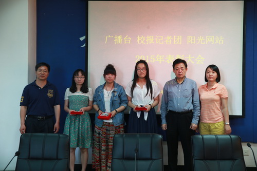 表彰会上,广播台台长王新宇、记者团团长袁奕好、阳光网站站长陈浩分别做了 2014 年度工作报告。于俊如宣读《关于表彰广播台、校报记者团、阳光网站优秀工作者的决定》和《关于奖励全国高校校报好新闻获奖者的决定》,与会老师为获奖同学颁发证书证书、奖金和纪念品,并合影留念。