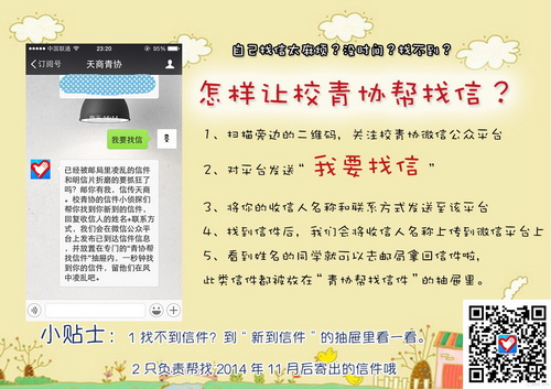 志愿者定期到邮局整理新到信件,整理收件人名单,借助青协的微信公众平台,推出“校青协帮你找信”活动,在微信中回复“姓名 + 联系方式”,系统会自动回复 11 月 1 日 以来抵校的信件信息,方便同学们追踪信件。此外,志愿者还对信件进行整理,按照收信人姓氏首字母将信件与明信片有序分类到九个抽屉中,这将缩短同学们找寻信件的时间。志愿者还手工制作了醒目的标签,注明信件分类方式,方便同学。