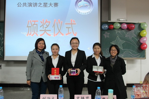 比赛以“公共热点、社会民生”为主题,分为两个环节,第一环节为定题演讲,旨在考查选手语言表达能力、分析问题能力,21 支参赛队的选手对社会热点的精彩分析与表达,赢得了现场的阵阵掌声;第二环节为即兴演讲,通过前一环节的精彩角逐脱颖而出的8 支参赛队再次用娴熟的语言表达及临场应变能力,为大家带来一场精彩的听觉盛宴。最终,公共 1203 班曹婕、杜泓瑞获得“公共演讲之星”一等奖;公共 1312 班王霞、张晓彤,公共 1304 班白苏日古噶、岳熹四名同学获得二等奖;姜珊、张冬亚等 16 人分获三等奖、优秀奖及最佳人气奖。