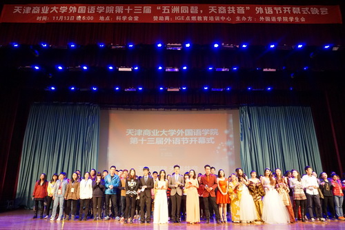 开幕式以精彩纷呈的晚会形式呈现在大家面前。 “ Don ’ t be shy, just have a try ...... ” 动感十足的劲舞拉开了本次晚会的帷幕。上届外文歌曲大赛冠军张洪盛携手罗雪带来的《 Living to Love You 》 和韩国留学生演绎的 《我的歌声里》,以其优美的旋律激活了观众的耳朵。待观众的视觉和听觉被唤醒之后,一场国粹京剧贯通观众五感。来自英语 1301 班的李奇函身着传统旗袍,轻轻一提国剧嗓,柔柔一拨兰花指,悠悠一移莲花步,带领观众一游《卖水·表花》。倾听完中国瑰宝京剧之后,观众又马上陷入刘芊汝和王子怡的西方音乐会中。两人荡漾在 Richard Clayderman 的 经典名曲《星空》下,钢琴与小提琴所奏出的音符洋溢全场,与台下的掌声交相辉映。完整的晚会永远少不了话剧,机械学院文艺部精心编排,一场《我的大学》以诙谐幽默的表演方式为当代大学生敲响警钟,传达出“大学四年,奋斗不息,梦想不止”的主题。“ give it to me , give it to me...... ”在和平时光乐队倾情伴奏下,马悦轩用极具爆发力的嗓音将 Michael Jackson 的经典重现,把晚会气氛推向高潮。当灯光再次点亮会场,英文配音秀和展示各大洲文化魅力的 T 台秀跃动全场热情。晚会接近尾声,外国语学院学生会全体成员以一曲《 相亲相爱一家人》 为整场晚会划下句号。