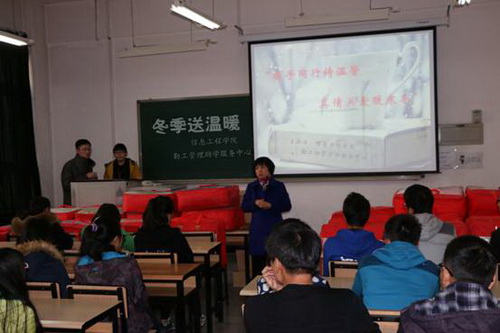 11 月 14 日下午,信息工程学院在三号教学楼 305 室举办了以“携手同行铸温馨·真情关爱暖寒冬”为主题的冬季送温暖活动。学院党委副书记王艳军,辅导员许兆光、金音老师出席。 2014 级 30 余名新生代表参加此次活动。