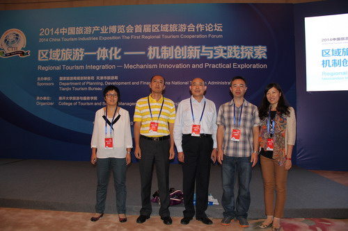 9 月20 日上午,作为 “2014 中国旅游产业博览会 ” 的重要组成部分,由天津市旅游局与天津市旅游教育分会联合主办的 “ 首届区域旅游合作论坛 ” 在天津市梅江国际会展中心 N9 厅举行。商学院副院长王庆生教授、旅游系金丽教授、旅游系主任胡宇橙副教授、酒店系主任李志刚副教授、旅游系冉群超博士、酒店系李烨博士等 6 位老师、《星空XK体育学报》编辑部朱慧娟编审以及旅游管理专业的研究生参加论坛。