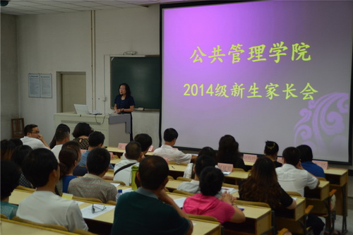 9 月 7 日 下午,公共管理学院 2014 级新生家长会在四教 101 召开。院党委书记白洪文、院长孙钰、院党委副书记刘均玲出席了会议,全体辅导员老师、新生班班主任、新生家长及部分新生参加了会议。