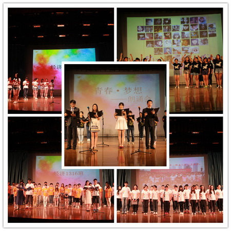 朗诵会上,参赛班级各显风采,各具特色,1315 班《此间少年正青春》通过诗歌加默剧的形式, 用优美的语言表达了对青春的热爱和对梦想的追求。1305 班《我的青春舞曲》以抒情为主,通过舞蹈与朗诵的完美结合,“5 ”动青春,“5 ”动奇迹,凸显青春之美。1313 班《奋斗吧!青年》通过对不同年龄段成长的描述,展现出青春的成长与变化,梦想的发芽与成熟,追求永不停止的精神。本次朗诵会还通过学生会网络微信平台“经经乐道”进行网络投票与互动环节。经过激烈角逐,经济学类 1315 班荣获一等奖, 1301 班和 1312 班荣获二等奖, 1313 班、 1305 班、 1307 班荣获三等奖。评审团还评审出优秀奖与鼓励奖。