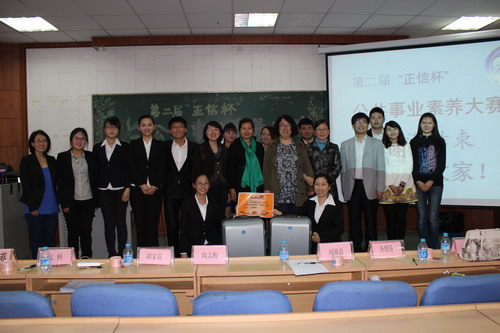 4 月9 日下午,公共管理学院第二届 “正信杯” 公共管理素养大赛在 3 号教学楼 110 教室举办。公共管理专业系主任陶志梅老师、系支部书记刘迎良老师、闫乃权老师、刘文花老师、齐艳芬老师以及辅导员安杨老师出席大赛并担任了评委。活动由公共管理协会承办,学院 2012 级、 2013 级学生约 150 余人参加。