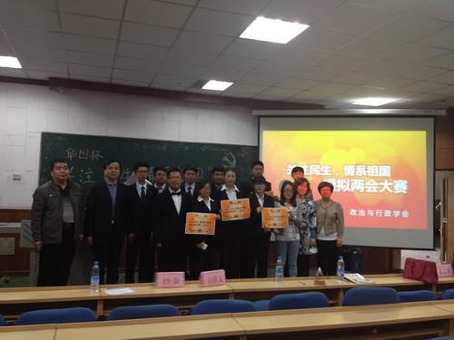 比赛分为两个环节:第一个环节是“建言献策”,由每个参赛队伍 围绕当前的时事热点问题形成模拟提案,通过 PPT 展示进行现场解说;第二个环节是“共商国是”,由行政管理专业大三学生担任提问嘉宾,根据提案内容对参赛选手进行提问,进一步考察选手对提案的研究和现场应变能力。 经过激烈的角逐,最终1201 班获得一等奖,1203 班获得二等奖,1301 班获得三等奖,1207 班获得最佳团队奖。白洪文书记在总结讲话中,充分肯定了活动的重要意义,并希望模拟“两会”活动能够越办越好,成为公共管理学院的品牌活动。