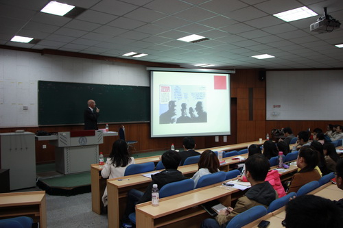 会见后,Cem Karayalcin 教授在三号教学楼110 为经济学院200 多名本科生、研究生做了“美国政府关门背后的经济事件和影响”的讲座,并与同学们进行了亲切的交谈,逐一回答了同学们的提问。