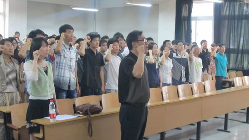 6月16 日9 : 30 ,机械工程学院在3 教202 召开党员宣誓仪式暨2013 届全体毕业生党员大会。机械工程学院党委书记李勤国、副书记刘振强、辅导员于雅岑出席大会,学院全体党员参加了活动。
