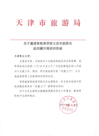 商学院副院长王庆生教授受邀,届时将为西藏昌都地区全体旅游管理干部进行授课培训,这也是王庆生教授继2009 年5 月赴新疆喀什、2010 年1月赴甘肃敦煌之后,第三次随市旅游局对口支持西部地区进行“旅游支教”授课培训。根据安排,王庆生教授将结合国内外先进旅游资源开发经验借鉴、理念更新以及管理创新等方面进行针对性培训。此行将进一步扩大星空旅游管理专业作为教育部特色专业和天津市品牌专业的影响。