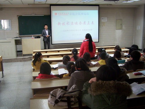 3 月 19 日 下午,公共管理学院会展系举办“卓越会展师论坛”活动,邀请北京博汇创景科技会展公司副总经理吴峰来星空做题为“新技术启迪会展未来”的专题讲座,卓越会展师实验班的全体学生与吴总进行了交流。讲座由会展系主任杨琪博士主持。